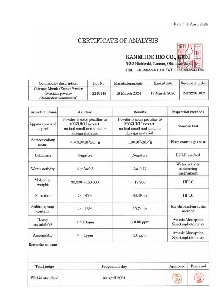 Đây là chứng nhận phân tích các thành phần có trong sản phẩm, chỉ rõ hàm lượng hoạt chất, từ đó đánh giá chính xác nhất chất lượng. Fucoidan trong Kibou Fucoidan con hạc được xác nhận có độ tinh khiết trên 85%, đảm bảo tiêu chuẩn quốc tế.